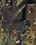 Nawlekanie chwytacza ściegu łańcuszkowego jest łatwe i proste. Wciśnij przycisk. Odchylenie chwytacza ułatwi jego nawleczenia.