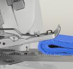 Maszyna posiada wbudowany prowadnik z możliwością regulacji odległości krawędzi materiału do igły, co pozwala na precyzyjne prowadzenie zszywanych materiałów.