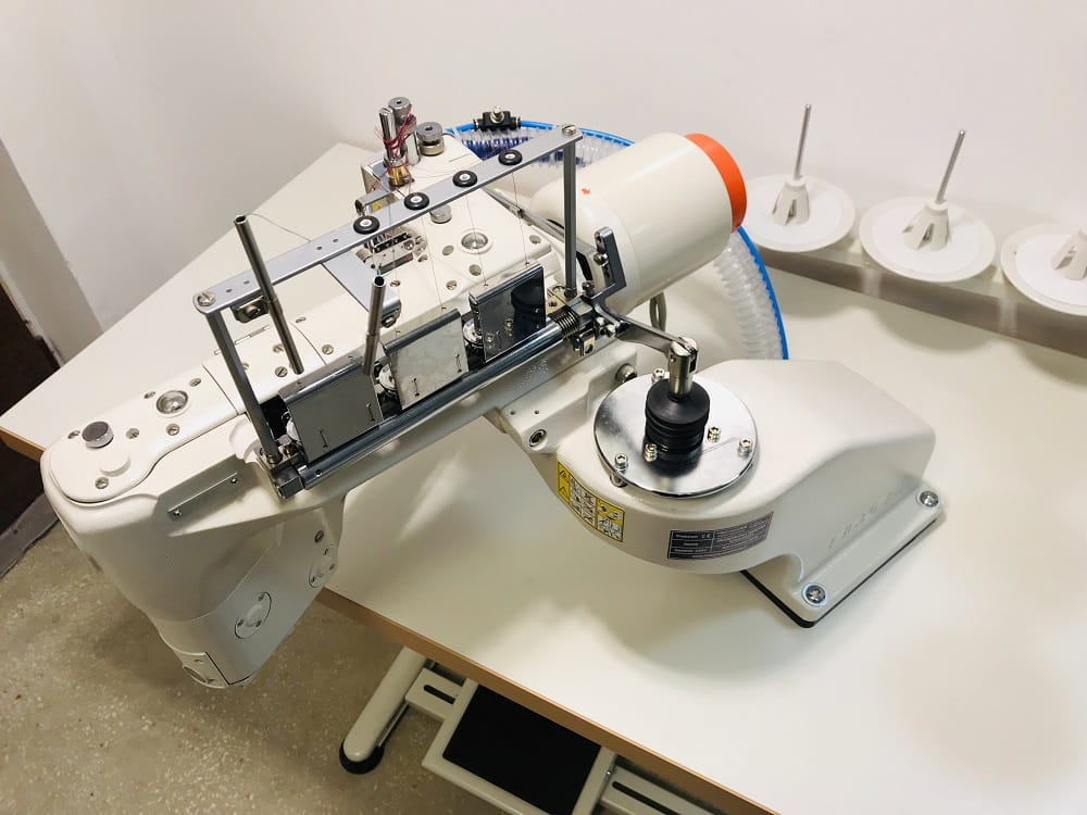 Autolap, maszyna ramieniowa, 4-igłowa, 6-nitkowa, z dolnym i górnym przeplotem, rozstaw między igłami 6,0 mm (lub opcjonalnie 5,2 mm), długość ściegu 1,6 - 2,5 mm, wysokość podnoszenia stopki 6 mm, prędkość szycia do 4200 ściegów/min.