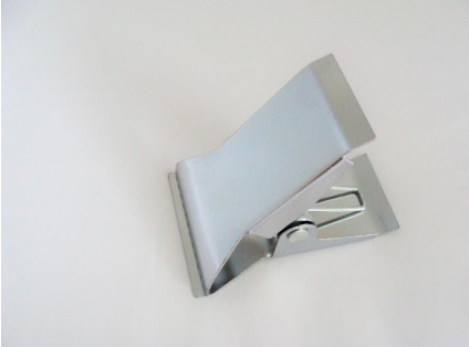 Metalowa klamra do tkanin, ząbkowany górny zacisk, dolny gładki. Długość klamry: 9cm, szerokość części zaciskowej: 6cm, głębokość: 3 cm, max szerokość po otwarciu: 4cm Sprężyna motylkowa.