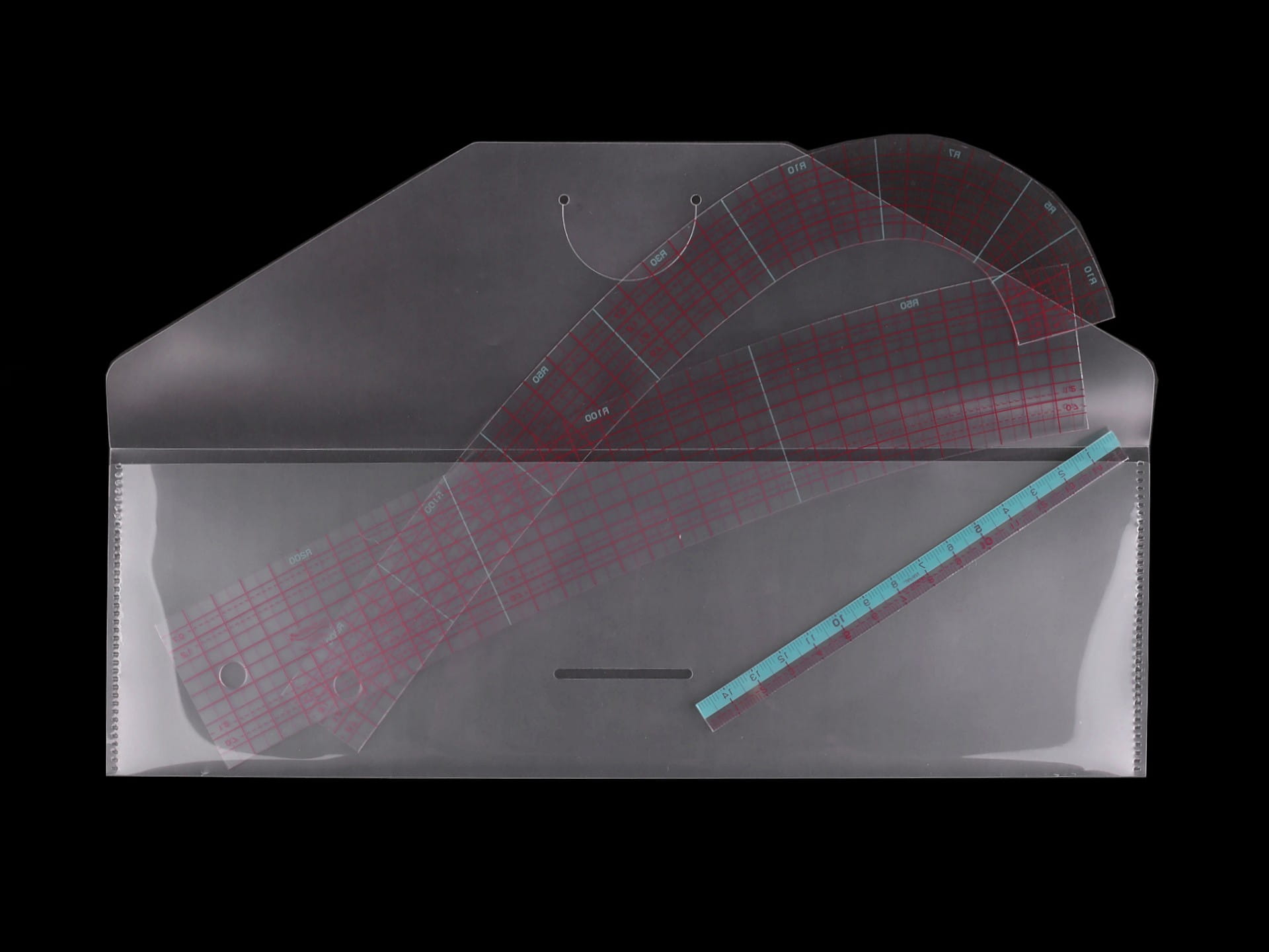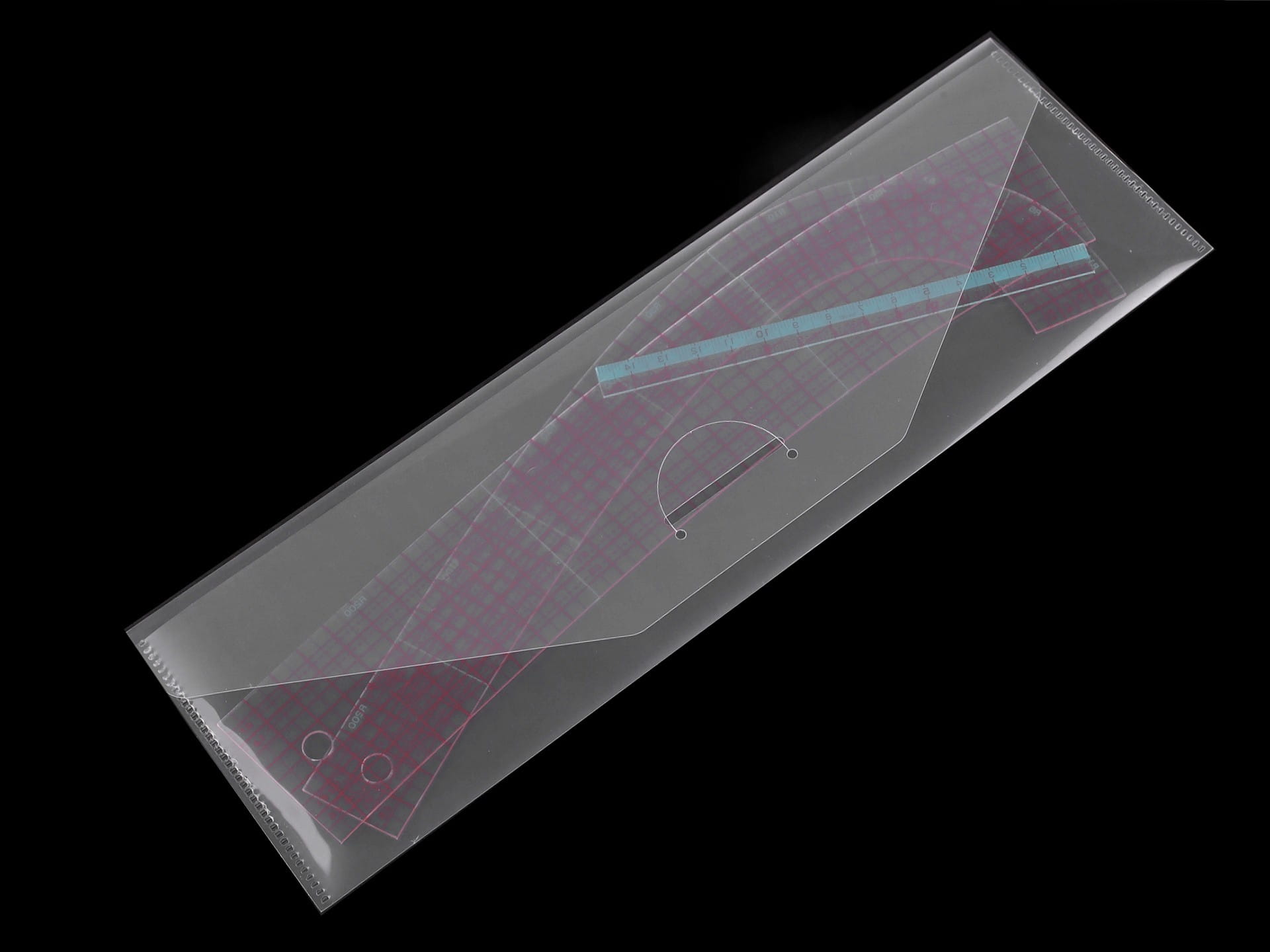 Zestaw linijek jest wykonany ze specjalnego tworzywa, które jest bardzo elastyczne. Krzywizny i linijka posiadają równoległe linie i krzywe wskazujące naddatki na szwy od 0,5 cm, które można łatwo narysować na kroju, ułatwiając pracę nad konstrukcją kroju i przy cięciu. Siatka jest wyraźna, w cm.