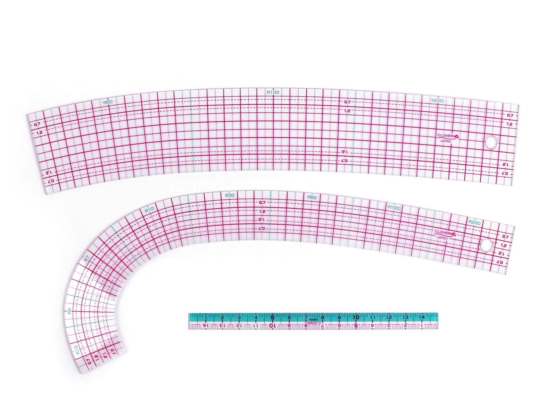 Zestaw zawiera: lekko wygięta linijka (do obszycia i boków), bardziej wygięta (do dekoltu i pach) oraz mini linijka 15 cm do drobnych prac.Wyprodukowano w Japonii.