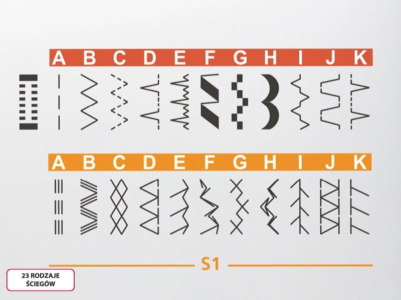 Maszyna posiada 23 niezwykle przydatne ściegi użytkowe i ozdobne. Do dyspozycji mamy ściegi owerlokowe do łączenia czy wykańczania materiałów. W zestawie znajdziemy także ściegi kryte, dzięki którym podszyjemy czy podwiniemy materiał w sposób niewidoczny od strony prawej (nie widać nitek). Bardzo przydatna jest też gamma ściegów specjalnych do materiałów elastycznych, czyli ściegów które się rozciągają wraz z materiałem i nie powodują jego marszczenia. Musimy jedynie pamiętać w tym wypadku o stosowaniu nici elastycznych. Wyjątkowe są także ściegi haftujące, którymi ozdobimy elementy odzieży.