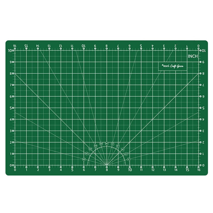 5 - warstwowa, dwustronna mata podkładowa TEXI GREEN z podziałką centymetry oraz cale w kolorze zielonym. Mata z zaznaczonymi kątami i liniami równoległymi o rozmiarze: 45x30 cm.