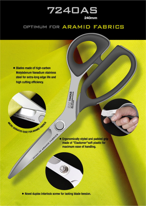 Nożyczki KAI 7240AS to najlepszej jakości nożyce klasy PREMIUM specjalnie skonstruowane do cięcia tkanin technicznych, twardych, tzw. ARAMIDÓW, KEVLARU, włókien szklanych oraz innych specjalistycznych. Są to profesjonalne nożyce firmy KAI o długości całkowitej 24 cm, długość ostrzy 8,5 cm. Mają mocne, sztywne ostrza, wykonane ze stali AUS6A utwardzone do 56+/-1HRC, matowione. Specjalne ostrza gwarantują genialną wytrzymałość i najlepszy komfort cięcia, dla lepszych efektów cięcia jedno z ostrzy pokryte jest mikroząbkami. Mogą ciąć zarówno tekstylia, skórę, papier, folie itp. Uchwyt dolny powiększony na 3-4 palce daje możliwość mocnego wygodnego chwytu. Wymiary otworów w uchwycie - górny 3,8x2,5cm; dolny 7,5x2,5cm. Nożyce są produkowane w Japonii.