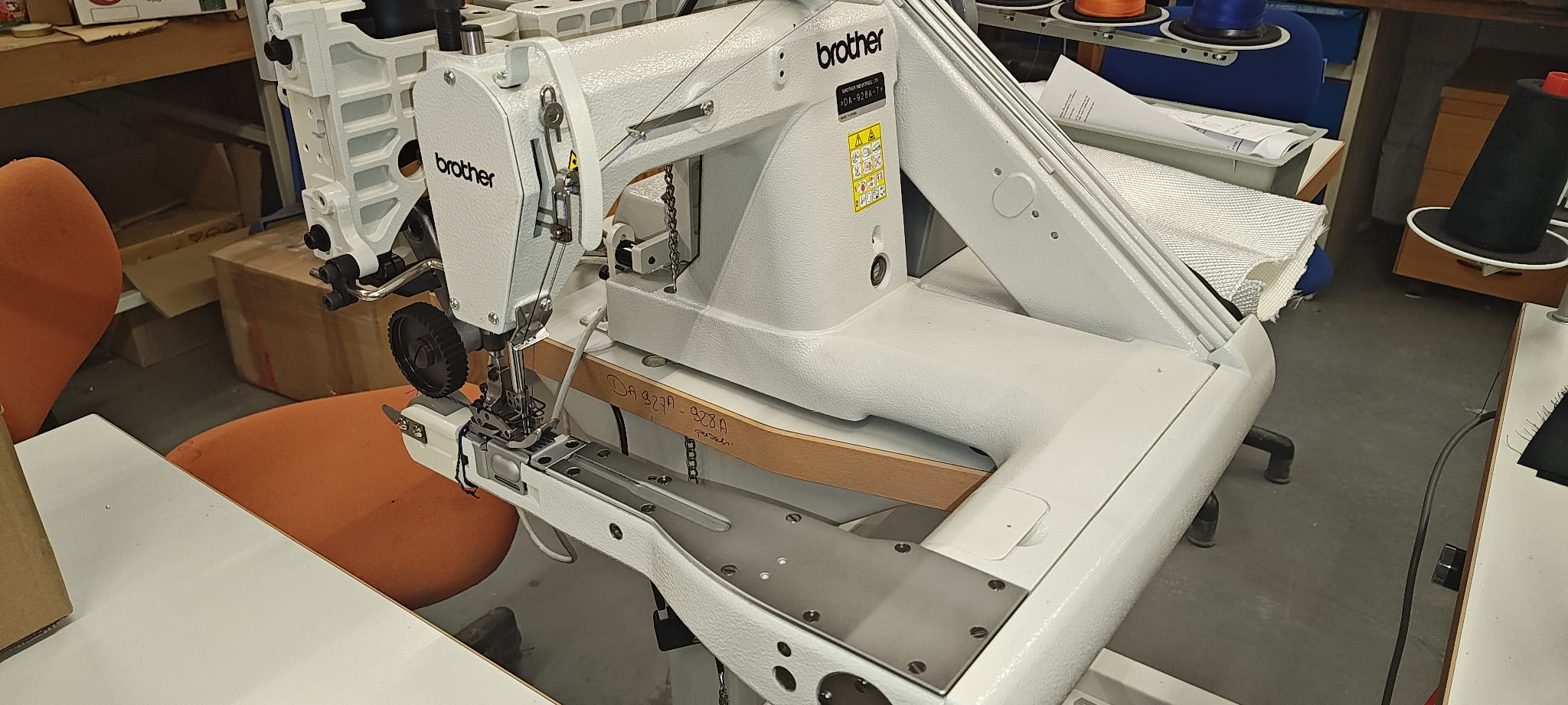 RAMIENIÓWKA BROTHER DA-928A-7-364EH-1/4"/puller. Maszyna trzy igłowa o ściegu łańcuszkowym przeznaczone do szycia szwów podwójnie zwiniętych – tzw. szew francuski (w zależności od podklasy : szwy boczne w nogawkach spodni, rękawach koszul, kurtkach i odzieży roboczej). Wyposażona w puller wspomagający transport materiału.