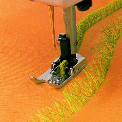 Stopka ta dzięki specjalnej konstrukcji umożliwia tworzenie ozdobnych frędzli i wypukłych, dekoracyjnych przeszyć. Frędzle tworzymy wykorzystując ścieg owerlokowy w maszynie do szycia, następnie wystarczy przeciąć jedną stronę przeszycia i gotowe. Natomiast wypukłe dekoracyjne przeszycia powstają przy użyciu gęstego ściegu zyg-zak. Przy pomocy tej stopki oryginalnie ozdobisz poszewki na poduszkę, bieżniki, obrusy czy nawet odzież. Stopka jest prosta w montażu i pasuje do maszyn z chwytaczem rotacyjnym i wahadłowym.