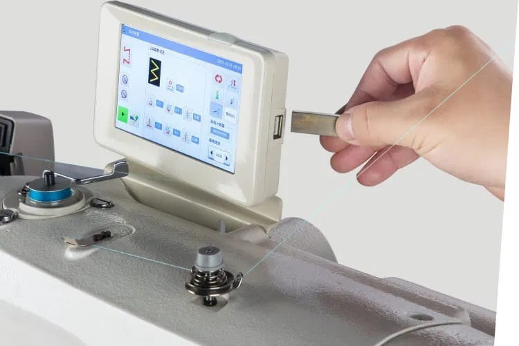 Zamknięty układ smarowania (brak typowej miski olejowej) gwarantuje mniejsze zużycie oleju, lepsze smarowanie mechanizmów maszyny a także zabezpiecza przed przypadkowym zaplamieniem materiału. Maszynę obsługuje się za pomocą intuicyjnego dotykowego panelu sterowania, na którym ustawimy dostępne parametry szycia. Pamięć maszyny posiada 14 fabrycznych wzorów oraz umożliwia zapisanie kolejnych 99 wzorów. Wbudowany port USB pozwala na zapisanie wzorów na zewnętrznej pamięci oraz aktualizację oprogramowania.