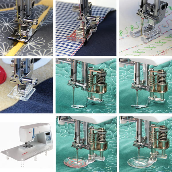 - dwie przystawki transparentnen idealne do pikowania nierównych powierzchni. Linie na stopce ułatwiają równomierne pikowanie. Te przystawki są szczególnie przydatna podczas pikowania techniką echo.